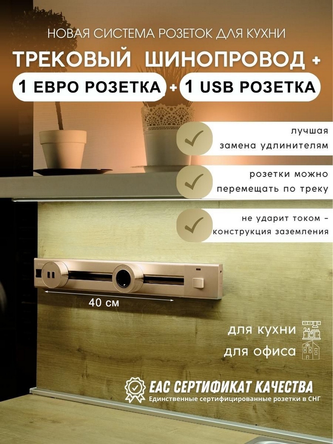 В комплект входит шинопровод 40 см + 1 USB + 1 евро розетка-адаптер Germany в золотом цвете.