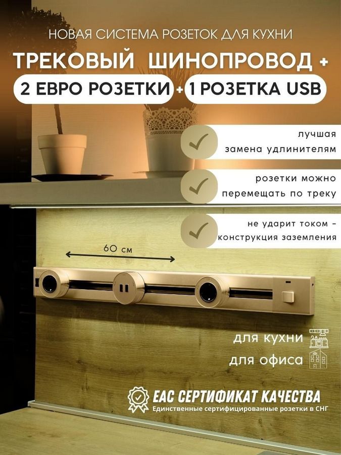 В комплект входит шинопровод 60 см + 2 ЕВРО розетки-адаптер Germany + 1 розетка USB в золотом цвете.