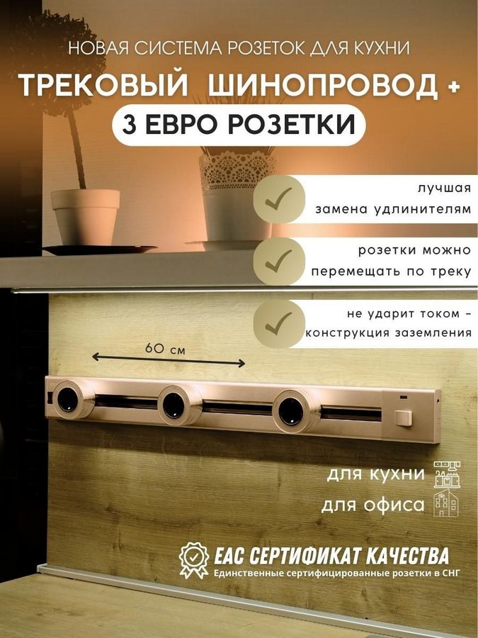 | Комплектация: | Трековый шинопровод; евророзетки - 3 шт |